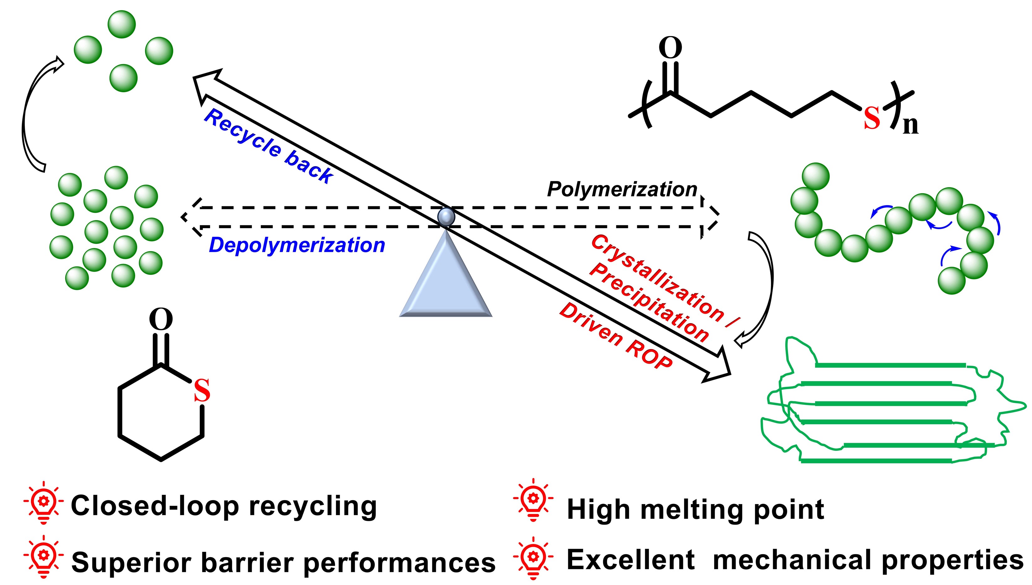 聚合物材料极大地促进了人类社会的发展,但其大量生产和不当处置也造成了资源和环境的双重挑战。与当前“生产-使用-废弃”的线性塑料经济模式不同,循环塑料经济强调在塑料服役结束后对其进行回收和再利用。开发能够解聚得到原始单体的闭合循环聚合物被认为是构建循环塑料经济的一项重要举措。闭合循环聚合物的开发在过去几年取得了巨大的成功,但仍面临挑战,包括单体制备过程繁琐、聚合物热学和力学性能不理想、价格远高于现有商品化塑料等。聚硫酯作为一类新兴高分子材料,因分子主链中硫原子的引入,兼具高热稳定性、优异力学性质和高效单体回收能力,成为学术界关注的焦点。