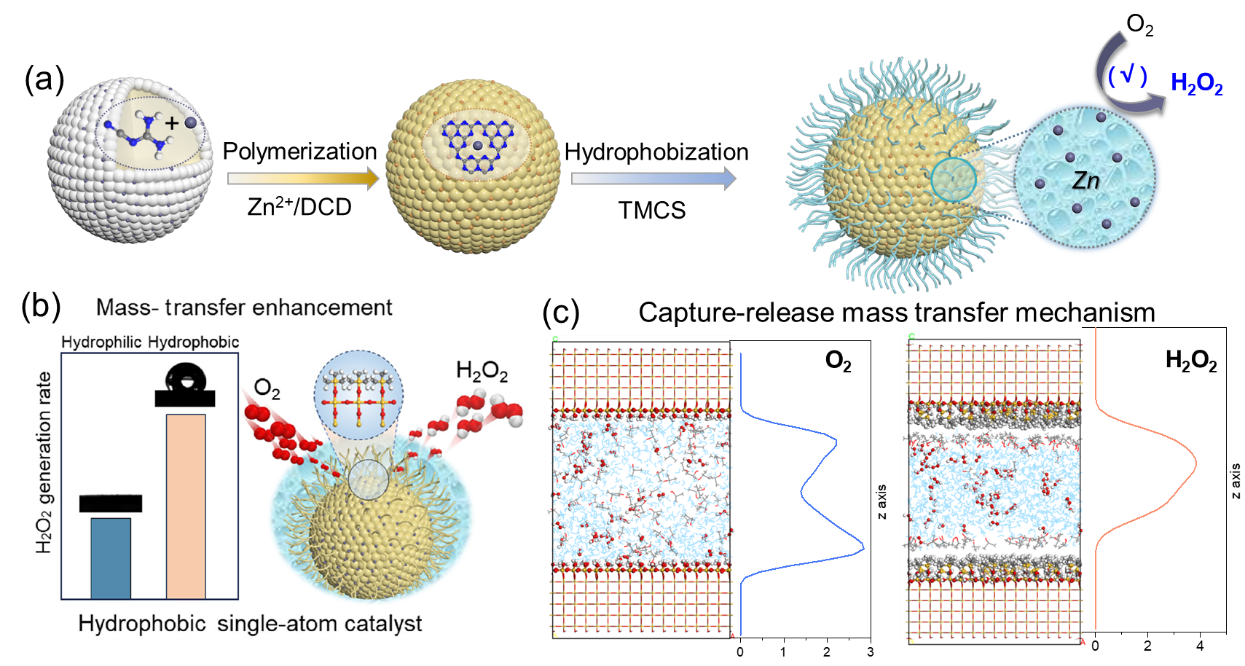 图2.疏水锌单原子光催化剂设计原理、三相界面形成及光合成H2O2性能。(a)疏水锌单原子光催化剂的合成示意图;(b)亲水与疏水催化剂H2O2生成速率对比;(c)分子动力学模拟“捕获-释放”传质机理。