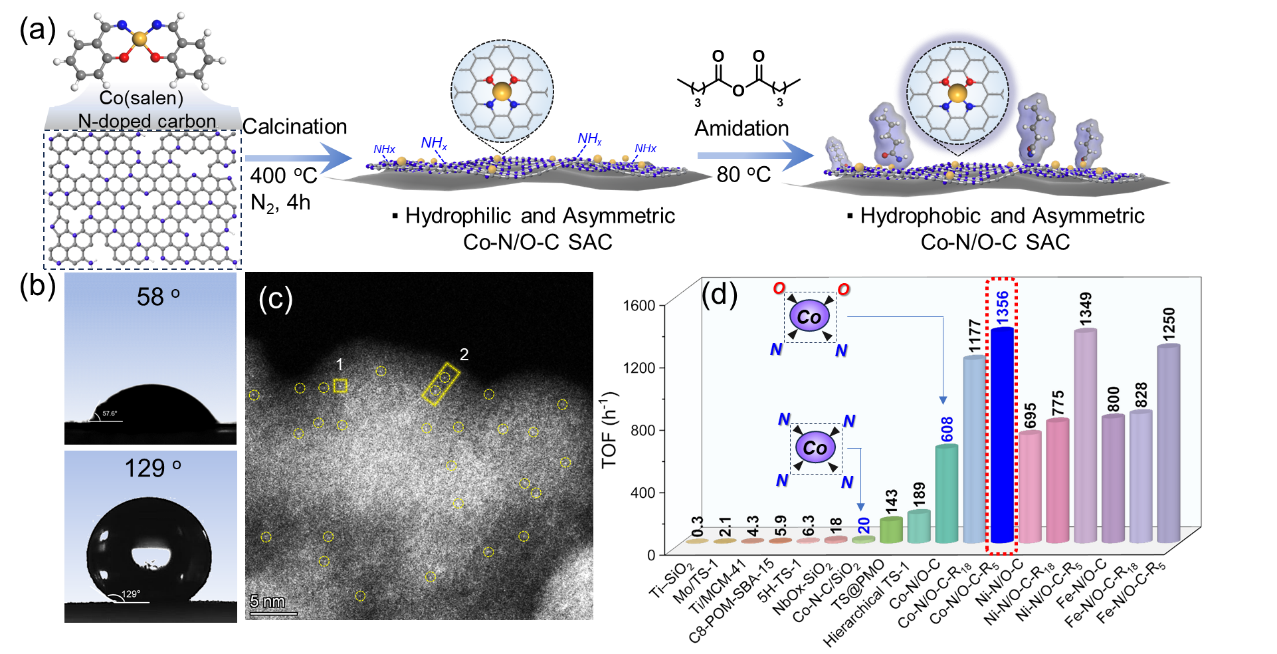 图1.非对称钴单原子催化剂设计示意图、结构表征及催化油酸甲酯环氧化性能。(a)催化剂合成与疏水化修饰示意图;(b)亲水与疏水催化剂表面静态水接触角;(c) HAADF-STEM图像证明钴单原子分散;(d)不同催化剂催化油酸甲酯环氧化的转换频率(TOF)对比。
