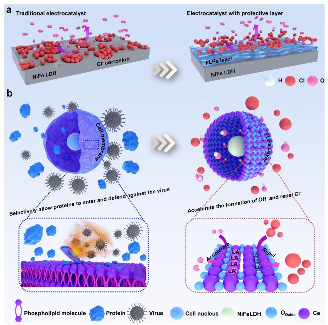在“双碳”战略深入推进的当下,氢能作为未来清洁能源体系的重要支柱,正迎来前所未有的发展机遇。海水电解制氢,被视为破解淡水资源紧缺、加快绿色能源布局的关键路径。然而,海水中的氯离子作为“隐形杀手”易引发氯副反应并腐蚀催化剂,使传统催化剂在海水环境中效率低、稳定性差,成为制约产业化的技术瓶颈。面对这一挑战,近日,KY开元集团官网迟京起副教授、王磊教授在国际顶级期刊Angew. Chem. Int. Ed. 2025, e202511867、Angew. Chem. Int. Ed. 2025, 64, e202414721上分别发表了题为“Bionic Design of Ni4+Lewis Acid Site Based on Selective Seawater Oxidation”和“Frustrated Lewis Pair Mediated f-p-d Orbital Coupling: Achieving Selective Seawater Oxidation and Breaking *OH and *OOH Scaling Relationship”的研究论文,两项研究通过仿生设计,成功开发出高活性、耐腐蚀的仿生结构催化剂,显著提升了海水电解制氢的效率和稳定性,为绿色氢能经济的发展提供了新思路。