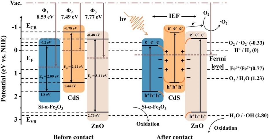 环丙沙星(CIP)作为第三代氟喹诺酮类抗生素被广泛使用,在水环境中持续累积已严重威胁生态安全和人体健康。本研究成功构筑了一种新型双S型CdS@Si-α-Fe2O3/ZnO三元异质结光催化剂,实现可见光驱动的“光-芬顿”高效降解CIP。
