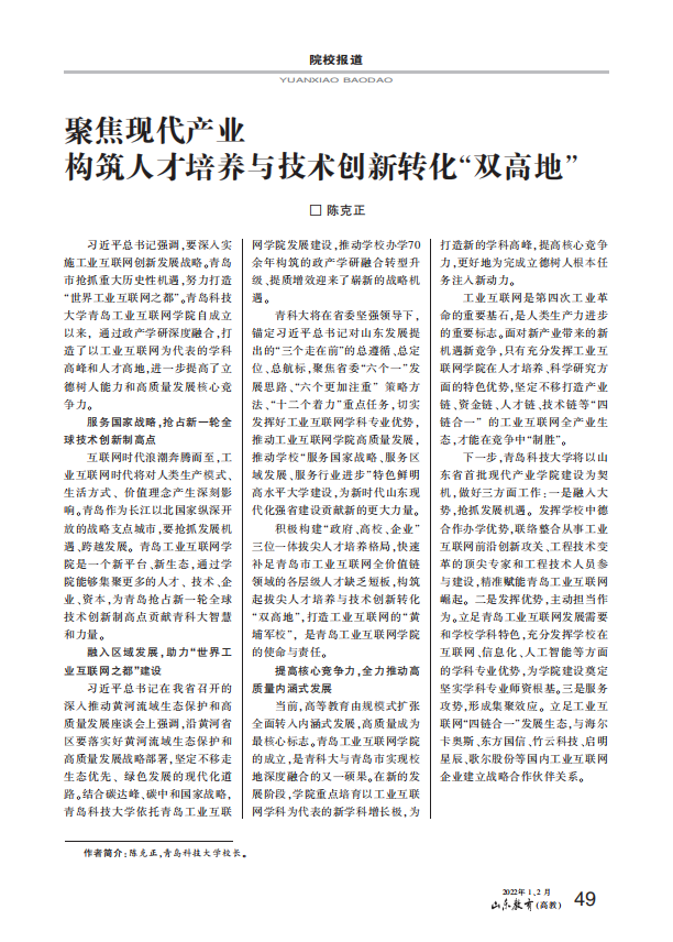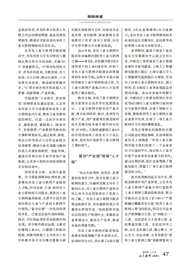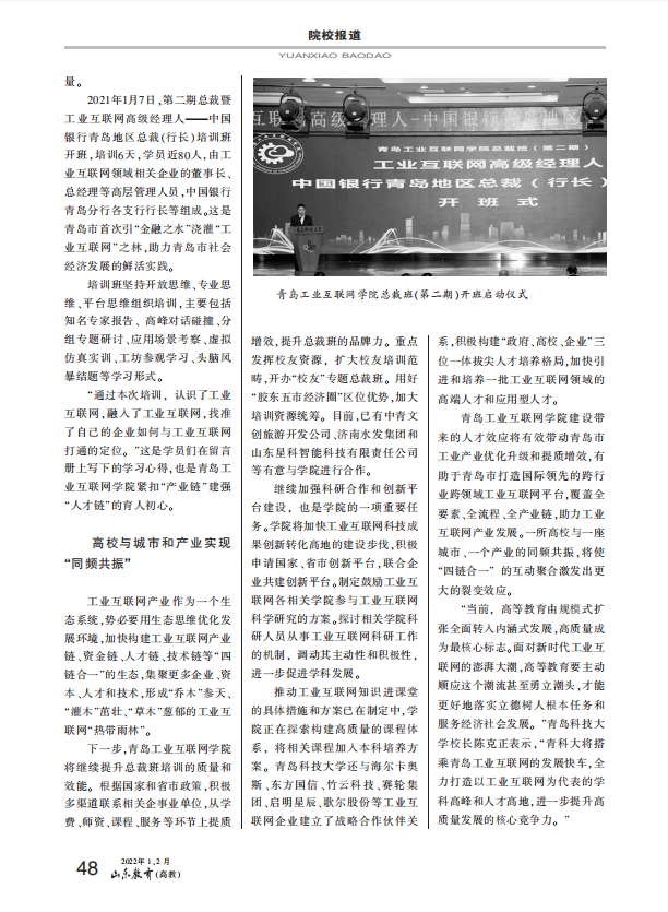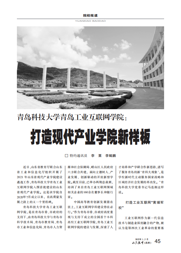日前,《山东教育》(高教)2022年1、2月合刊刊发学校党委书记马连湘署名文章《勿忘昨天 无愧今天 不负明天 从六中全会精神中汲取智慧和力量》、校长陈克正署名文章《聚焦现代产业 构筑人才培养与技术创新转化“双高地”》。在“院校报道”版块以《KY开元集团官网青岛工业互联网学院:打造现代产业学院新样板》为题,详细报道青岛工业互联网学院创建成效。