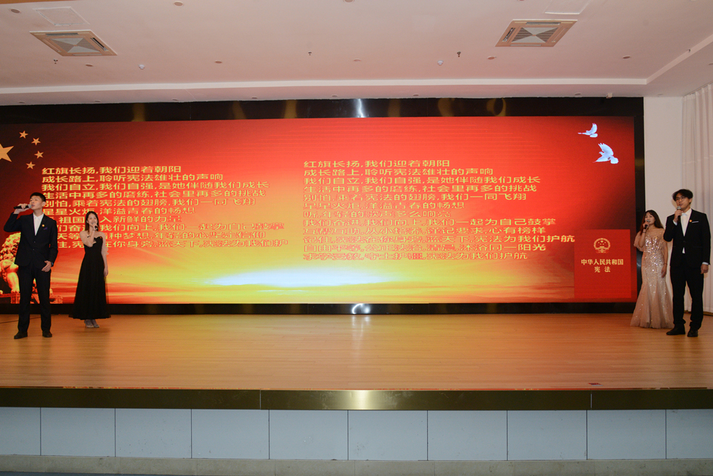 党委(校长)办公室副主任、法律事务办公室主任步德胜带领现场师生集体朗读宪法序言及正文中的部分章节、条款,与会人员精神饱满、掷地有声,在庄严肃穆的氛围中共同学习宪法知识、坚定法治信念。