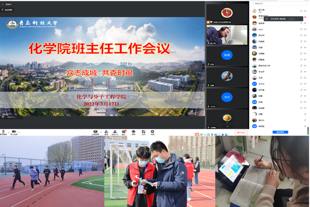化学院围绕疫情防控工作大局,加强组织领导,压实防控责任,召开疫情防控线上工作会议,传达学校疫情防控工作会议精神,切实做好学院的安全稳定工作,同时研判、创新线上教学平台、远程科研安全、管理服务到位等工作,确保线上教学、科研高质量运行。确保两大作风:人员在岗和手机在线,辅导员、班主任全员上阵、全时在线、全力以赴,吃透精神,严格流程,总结经验,汲取教训,坚持以生为本,精准摸排准每位学生情况。守住三条底线,关心学生思想动态、身心健康、线上学习等情况,认真回应学生关切,高效解决学生实际困难。培训四支队伍:学院辅导员、班主任、学生骨干/党员、宿舍长,召开培训会,确保信息畅通,保证思路上融合、工作上契合、资源上整合、力量上联合,畅通工作“最先一公里”和“最后一公里”。牢树政治意识、大局意识、责任意识、规矩意识、服务意识,守护学生生命健康安全。