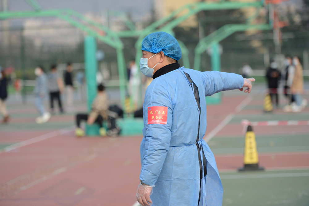 现场,他们正按照分组员、调度员、引导员、秩序员等分工,各司其职进行现场引导、秩序维护等工作,在密不透风的防护服下完成近4小时的志愿服务。在这支队伍里既有即将退休的老同志、又有腰间盘突出的患者,既有党员干部、又有普通教师,他们值守在核酸检测现场,但是没有一人喊苦喊累。杨娥老师看到学生即将被绊倒,冲上前想把学生拉住,却不慎摔倒受伤,但仍然坚守到最后一个检测者才肯离开。