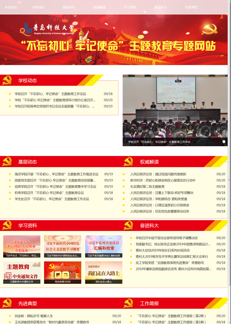 专题网站设有“学校动态”“基层动态”“权威解读”“学习资料”“奋进科大”“先进典型”“工作简报”等七个栏目,将及时发布学校开展主题教育的动态信息、提供主题教育学习资料、宣传先进师生典型等,在全校掀起“不忘初心 牢记使命”主题教育的热潮。