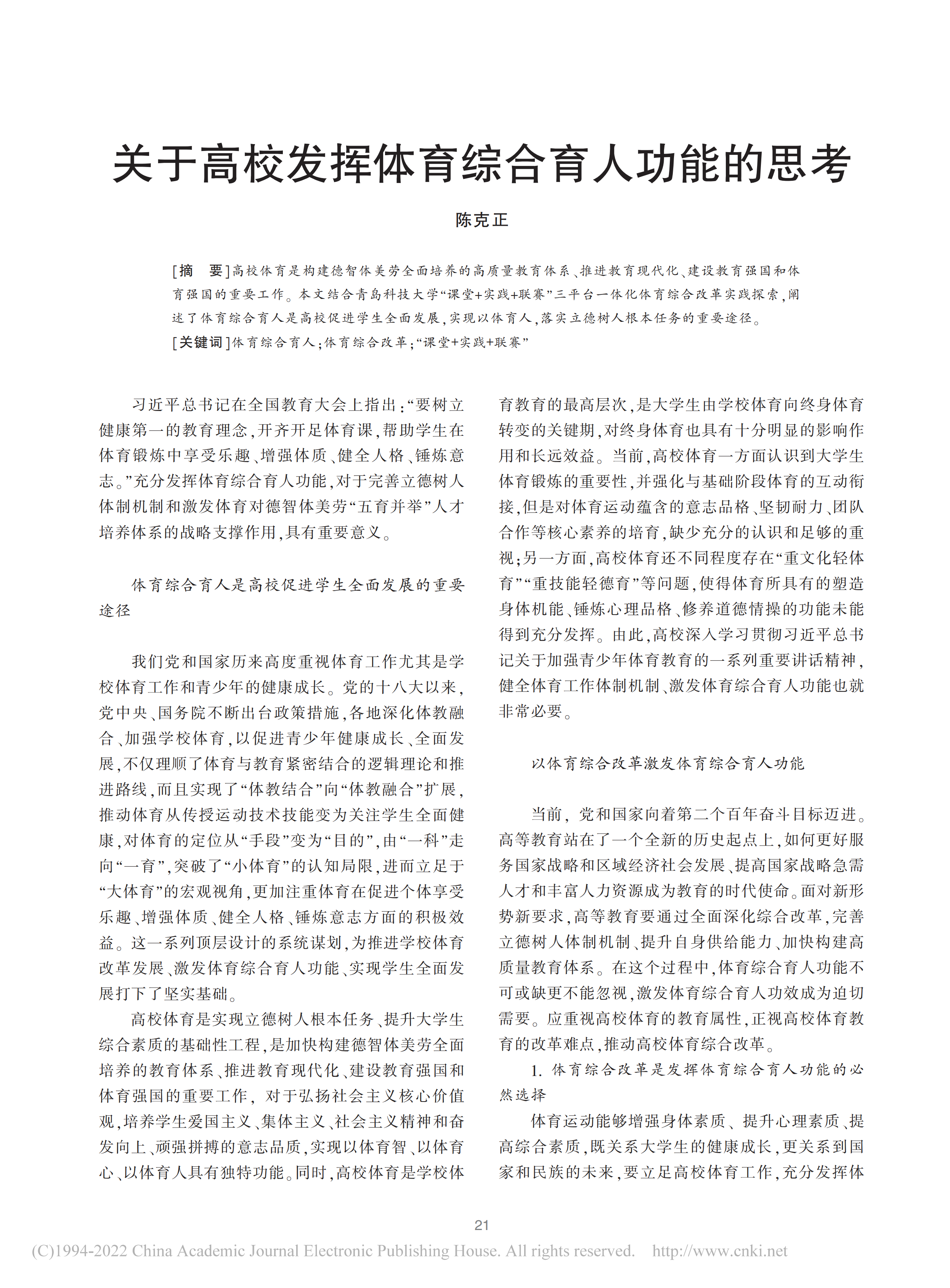日前,《中国高等教育》(CSSCI来源期刊)刊发校长陈克正署名文章《关于高校发挥体育综合育人功能的思考》。