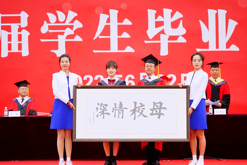 毕业典礼在雄壮的国歌声中拉开帷幕。党委书记李兴伟代表学校接受毕业生赠送给学校的书法作品《母校情深》、大学生科技创新参赛作品《青科大记忆》、国画作品《桃李满园》。李兴伟代表学校向毕业生代表回赠“喜迎二十大•奋进新征程”纪念卡,寄语毕业生要厚植家国情怀、传承科大家风、争做时代新人,奋力描绘“青科大人的样子”、书写“青科大人的担当”,为母校增光、让人生出彩!