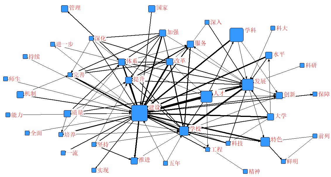 通过图5可以看出,建设、学科、发展、人才、学校等占据网络的核心位置,其他词汇都是围绕他们展开。关联性较强的词汇是(按关联性依次减弱排序):建设、发展、人才、创新。