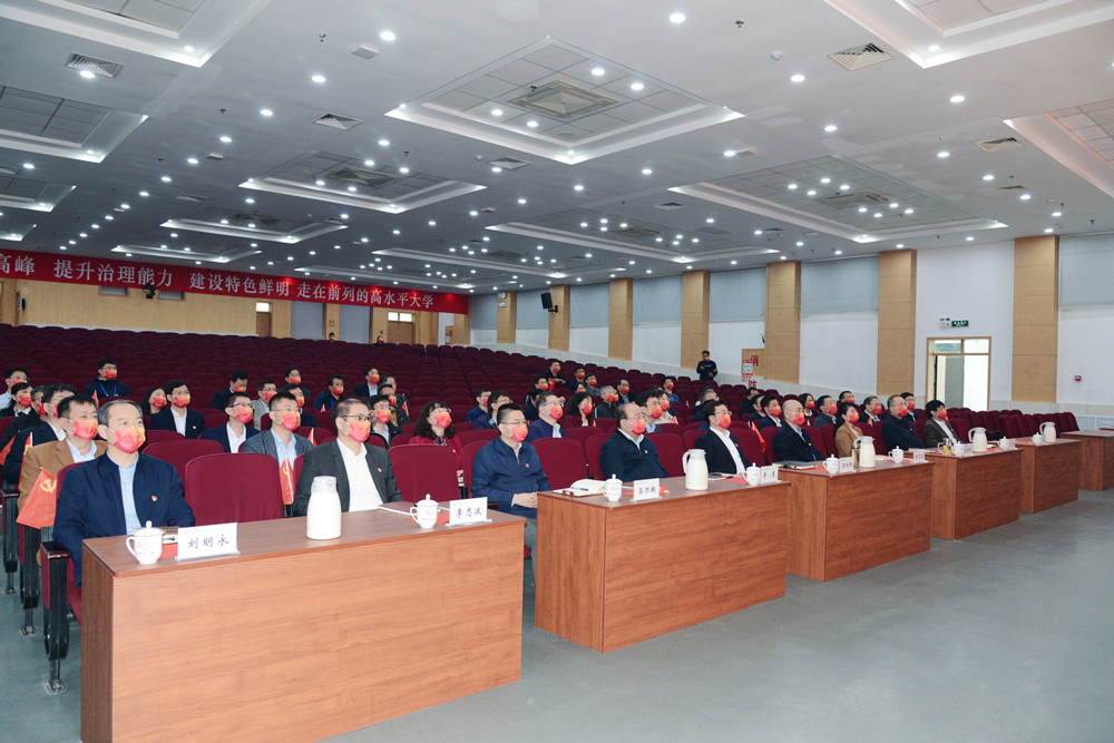 学校党委理论学习中心组成员以及党委、纪委委员、各院级党组织书记、各职能部门负责人在崂山校区第二报告厅集中观看大会直播。