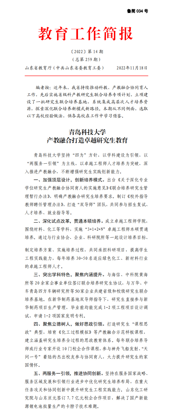 日前,山东省教育厅《教育工作简报》(第14期)刊发了学校产教融合协同育人工作的典型经验做法,全文如下:
