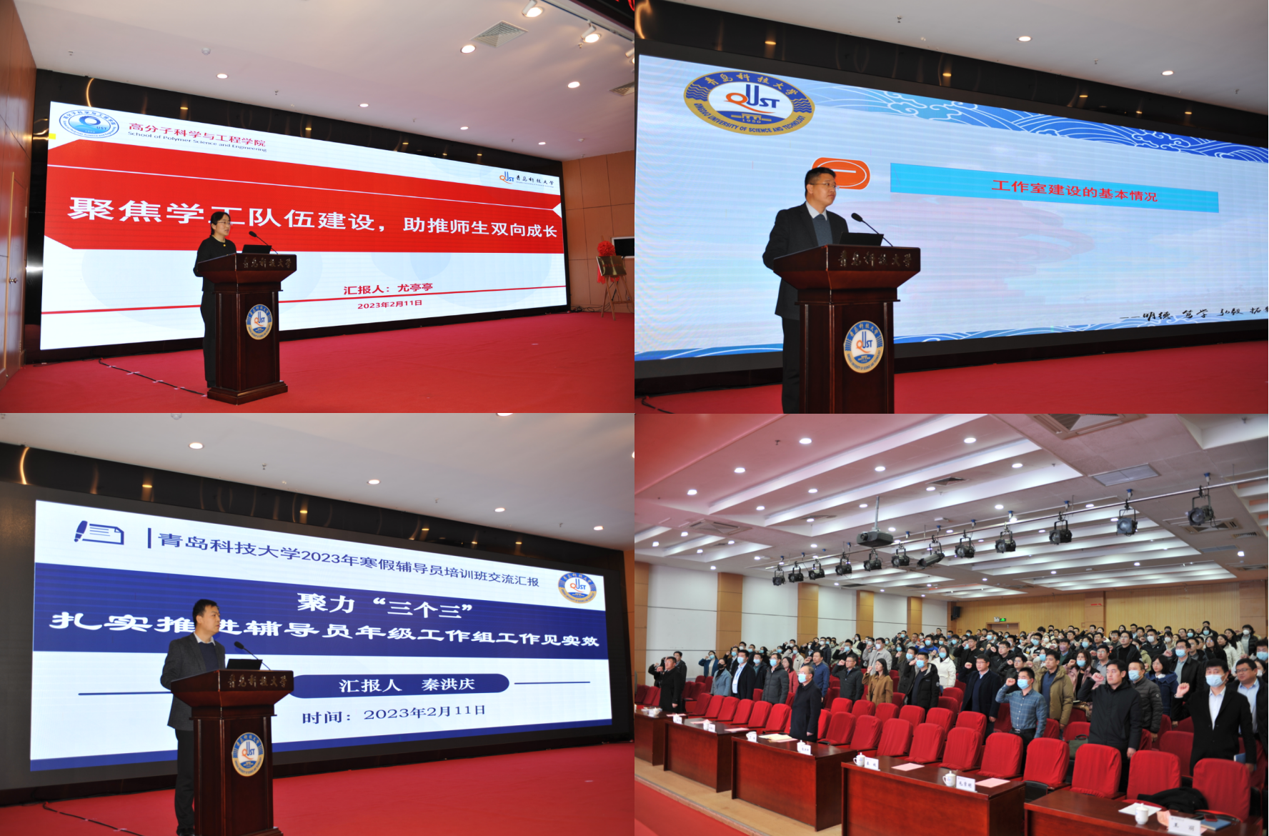 在专题报告环节,秦姣以《如何坚守学生工作初心》为题,从个人工作的“精诚实度”和团队工作的“精诚团结、相互协作”两个方面,配合生动翔实的案例,讲授了辅导员工作经验与实践感悟;2022年全国“最美高校辅导员”、山东科技大学范俊峰副教授以《主辅协同六导四员促进高校辅导员育人能力提升》为题,从辅导员的角色定位、自身贡献、工作方法和发展路径四个方面传授了经验与技巧;2022年全国“高校辅导员年度人物”、山东理工大学张佳副教授以《新时代背景下辅导员工作开展与能力提升》为题,从辅导员工作的变化与特点、工作开展和能力提升三个方面,讲授了育人理念和方法路径,为辅导员专业化职业化发展理清了思路、明晰了路径。