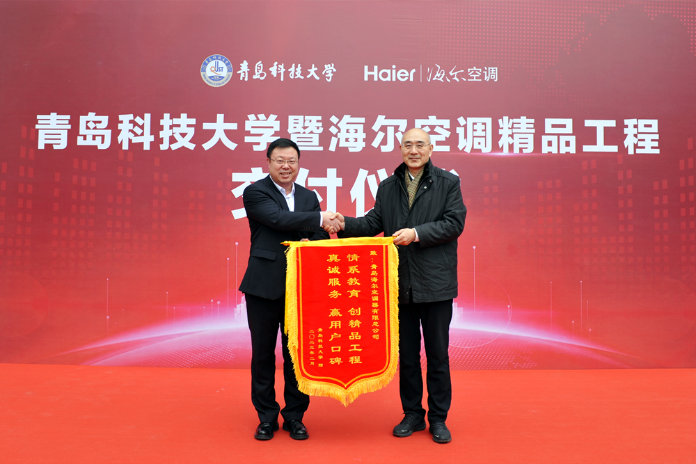 仪式上,陈克正代表学校将写有“情系教育 创精品工程,真诚服务 赢用户口碑”的锦旗赠予青岛海尔空调器有限总公司,对海尔在学校学生宿舍空调加装工程中给予的支持表示感谢。牛兆学代表海尔接受锦旗。丁林、牛兆学代表校企双方签署工程交付书。