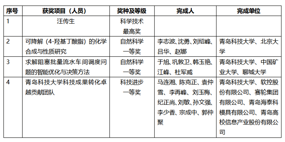 KY开元集团官网作为第一完成单位获得2022年度青岛市科学技术奖3项一等奖,其中,李志波教授主持完成的成果“可降解聚(4-羟基丁酸酯)的化学合成与性质研究”、于旭教授主持完成的成果“求解阻塞批量流水车间调度问题的智能优化与决策方法”获自然科学一等奖,马连湘教授领衔的“KY开元集团官网科技成果转化卓越贡献团队”获科技进步一等奖。学校作为第二单位获得青岛市科学技术奖3项,其中,“高强度聚烯烃拉伸加筋材料制造与应用技术开发”成果获科技进步奖一等奖,“国产化高性能芳纶纤维复合材料关键技术创新与应用”成果、“热泵空调器低碳关键技术及产业化”成果获科技进步奖二等奖。