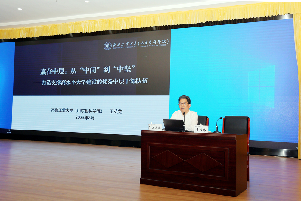 24日下午,王英龙以“从‘中间’到‘中坚’——打造支撑高水平大学建设的优秀中层干部队伍”为题,从“贯彻落实中央决策部署,找准高校使命担当”“深化内部体制机制改革,提升高校治理能力”“践行新时代好干部标准,打造高校中坚力量”三个方面,分析了当前高等教育面临的形势任务、高校的责任使命,分享了近年来齐鲁工业大学推进校院两级组织体系改革、人事人才制度改革、财务制度改革、教育教学改革、全链条科技创新的主要做法,对如何评价中层干部能力、怎样成为中坚力量进行了系统阐释。报告内容丰富、观点清晰、分析透彻,为学校进一步推动改革走深走实、激发办学活力提供了重要的指导意义和借鉴价值。