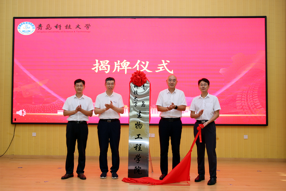 仪式上,张先恩、陈克正、生物工程学院党委书记周宪锋、生物工程学院院长顾玉超共同为生物工程学院揭牌。