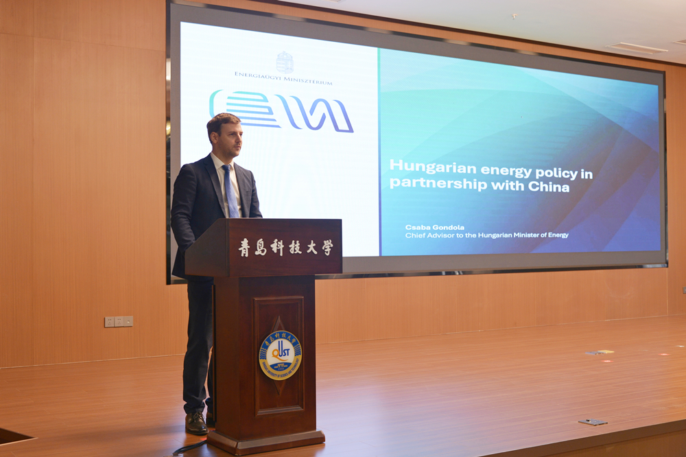 会见结束后,Csaba Gondola在崂山校区软控报告厅作了题为“匈牙利能源转型与中国合作”(Hungarian energy policy in partnership with China)的学术报告。他详细介绍了欧盟能源发展形势、匈牙利绿色转型最新进展,并重点分享了匈牙利能源发展战略三大支柱太阳能、核能和储能发展进展。Csaba Gondola表示,中国是匈牙利非常可靠的合作伙伴,欧洲和匈牙利经济和能源转型离不开中国,愿意构建合作桥梁,推进匈牙利和中国在经济、能源气候等领域开展更多务实合作。