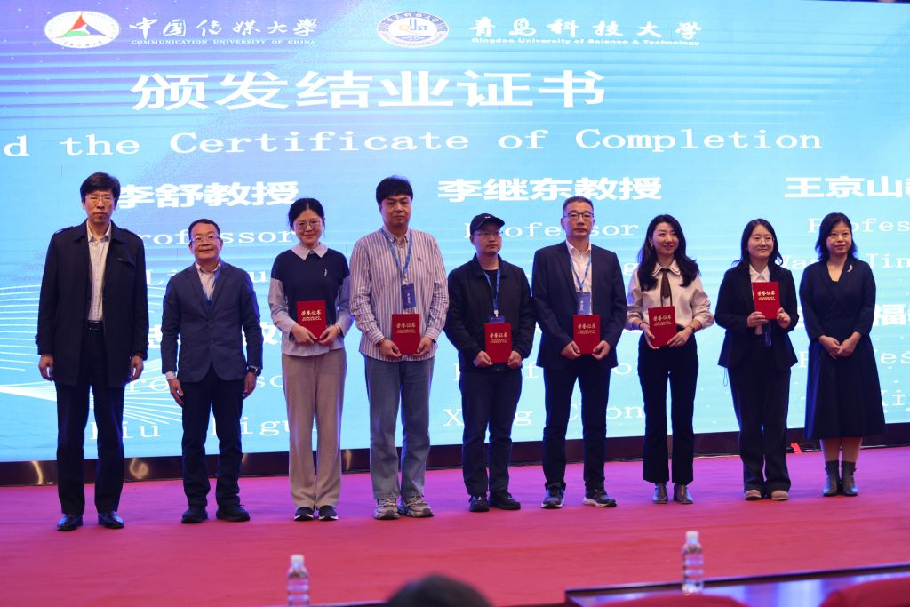 第六届传播学与出版学师资班邀请了中国传媒大学媒体融合与传播国家重点实验室首席科学家沈浩,教育部“长江学者”特聘教授、北京大学(青岛)计算社会科学研究院院长王腾蛟,新华社国家重点实验室总架构师蔡昌艳,青岛出版集团党委书记、董事长贾庆鹏等重量级嘉宾进行主题演讲,内容既涵盖了人工智能、计算传播等新兴领域,又聚焦于新闻业务、版权价值等热点话题。传媒学院党委书记刘志国宣读了师资班结业名单,与中国传媒大学传播研究院院长李舒、副院长李继东为学员代表颁发结业证书。北京印刷学院出版学院黄莹、KY开元集团官网传媒学院刘梦露分别作为学员代表发言。