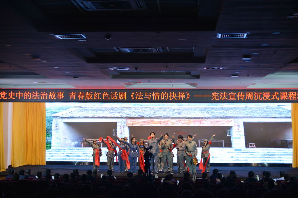 《法与情的抉择》是融党史党纪和国法于一体的大型话剧,以“十大经典红色司法案例”之一“黄克功案”为背景,重温毛泽东同志《给雷经天的信》,通过“讲台-舞台-讲台”方式,深情打造了一堂沉浸式汇报演出课程,深刻讨论法理与人情的关系,充分诠释中国共产党人“以人民为中心”的法治初心,生动展现新民主主义革命时期中国共产党领导的法治建设历程,引导师生深入领会“法律面前一律平等”的宪法精神,为创建全省依法治校示范校,在法治轨道上深化学校改革、加快治理现代化营造良好的校园文化氛围。