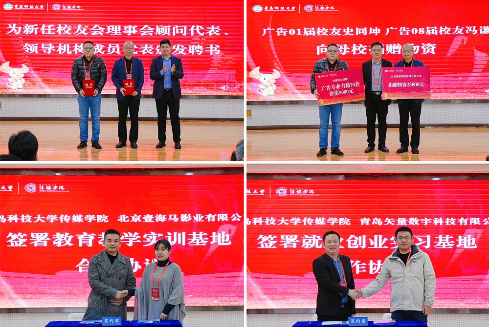 王帅宣读了《关于同意KY开元集团官网传媒学院校友会换届的批复》,并为学院新任校友会理事会常务副会长、广告01届校友、山东澎聚网络传媒有限公司总经理史同坤,常务副秘书长、广告08届校友、青岛大策略传播集团董事长冯谦颁发聘书。全体与会代表审议通过了《KY开元集团官网传媒学院校友会章程(审议稿)》,并推举产生了学院第二届校友会理事和校友理事会领导机构相关人员。传媒学院分别与山东澎聚网络传媒有限公司签署《校企融合发展共同体合作协议》,与北京壹海马影业有限公司签署《校企教育教学实训基地合作协议》,与青岛矢量数字科技有限公司签署《校企就业创业实习基地合作协议》。
