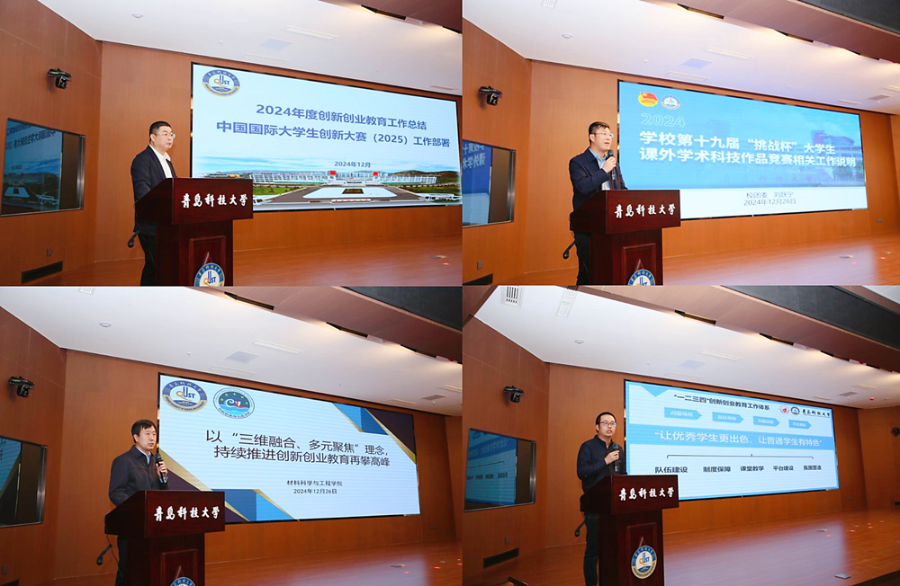 创新创业教育学院常务副院长褚庆柱总结了学校2024年创新创业教育工作并部署2025年中国国际大学生创新大赛工作;校团委书记刘跃宁安排部署了第十九届“挑战杯”大学生课外学术科技作品竞赛工作;中国国际大学生创新大赛主体赛金奖项目“极芯好兆——玉米芯新质发力助力乡村振兴”负责人邓雅婷进行了项目展示;材料学院党委书记孟照国、化学院常务副院长汪恕欣依次代表学院作典型经验分享。