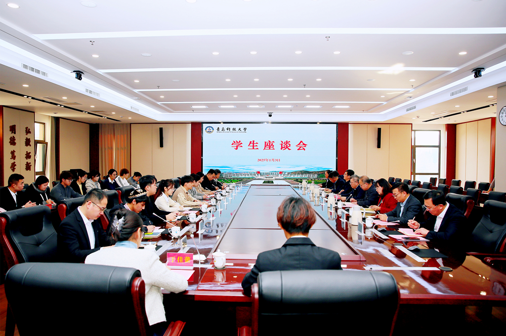 1月3日,学校在崂山校区赛轮会议室召开学生座谈会。党委书记杨天梅出席会议并讲话,党委常委、副校长丁林出席会议。