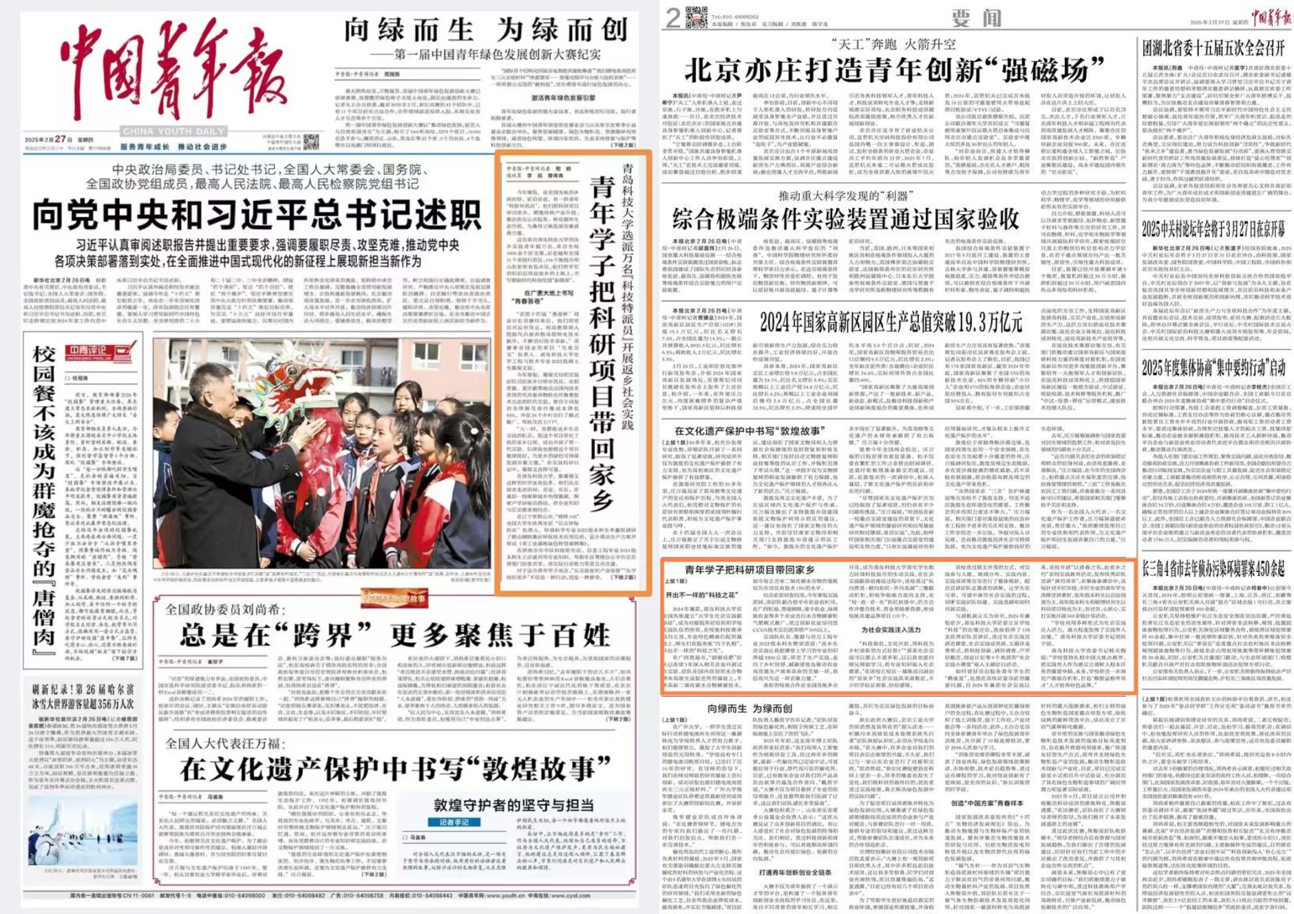 2月27日,《中国青年报》头版刊发KY开元大学生“返家乡”社会实践工作相关报道,报道以《青年学子把科研项目带回家乡:KY开元集团官网选派万名“科技特派员”开展返乡社会实践》为题,从“在广袤大地上书写‘青春答卷’”“开出不一样的‘科技之花’”“为社会实践注入活力”三个方面,展示万名科大青年学生将专业所学应用在家乡土地、书写新时代科创报国“新篇章”的奋斗征程。2024年,学校共青团在全国31个省级行政区、166个地级市和山东省所有县市区建立“大学生社会实践联络站”,精准对接地方政府、企事业单位与师生团队的双向需求,持续推动大学生“社区实践”“三下乡”“返家乡”等社会实践工作走深走实。以下为报道原文: