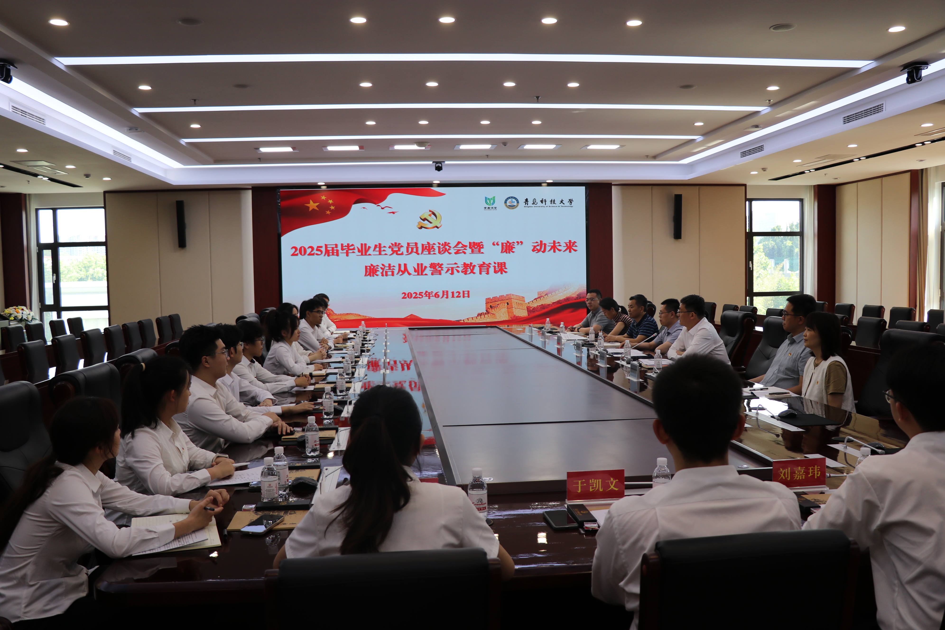 为推动深入贯彻中央八项规定精神学习教育走深走实,6月12日下午,学校在崂山校区赛轮会议室举办2025届毕业生党员座谈会暨“廉”动未来廉洁从业警示教育课。党委常委、组织部部长朱敬义,党委办公室(校长办公室)主任兼党委巡察工作办公室主任毛常明,纪委副书记王江忠参加活动。