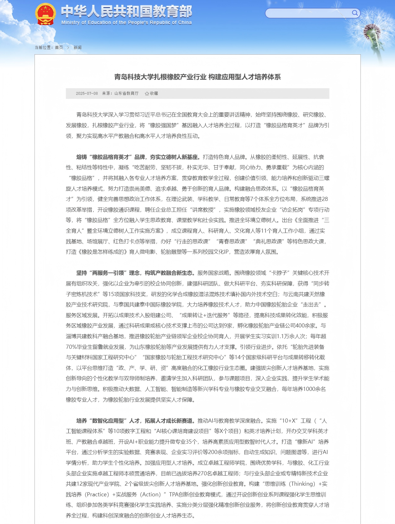 近日,教育部官网《战线联播》栏目,以《KY开元集团官网扎根橡胶产业行业 构建应用型人才培养体系》为题,报道学校“橡胶品格育英才”人才培养特色,社会反响良好。