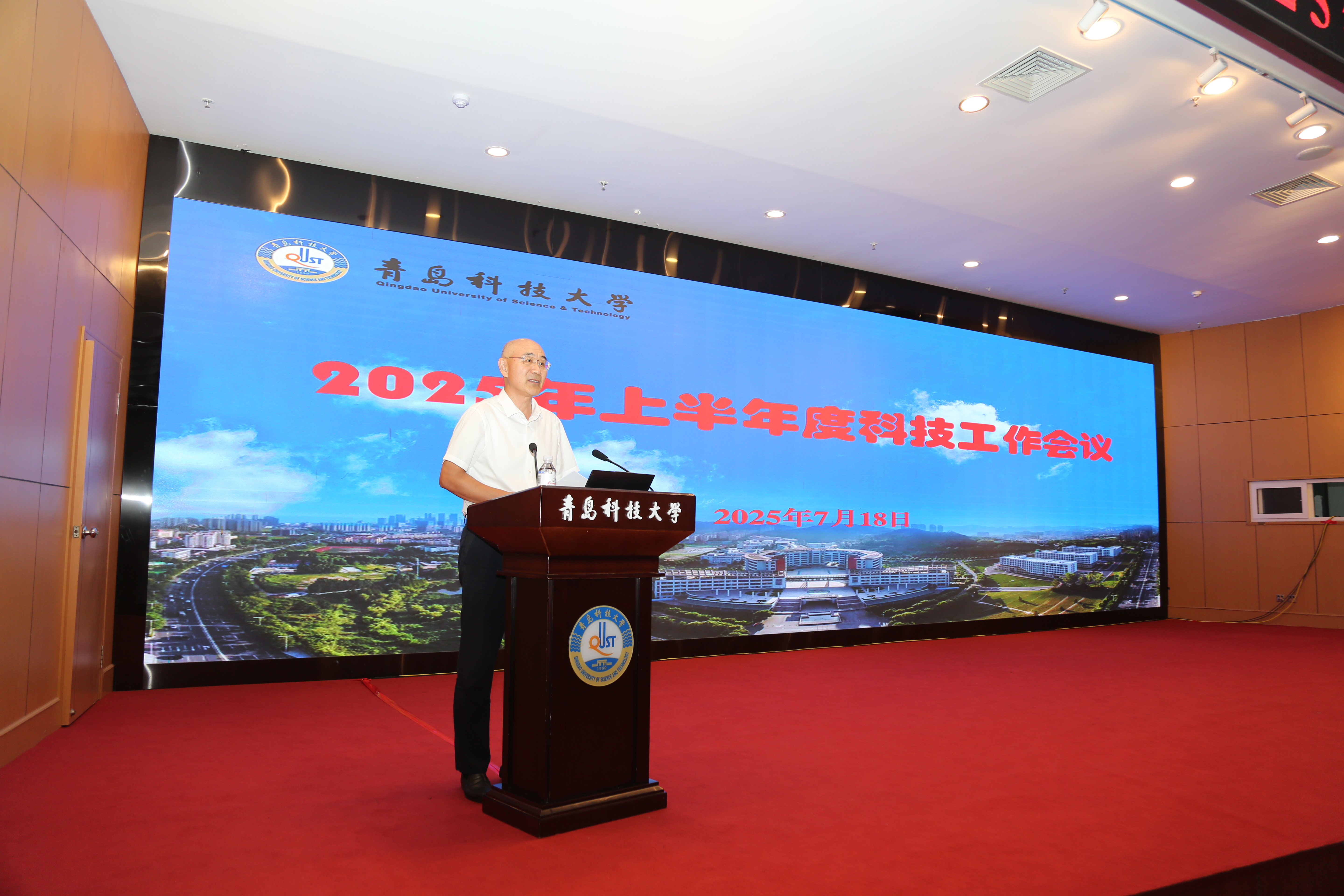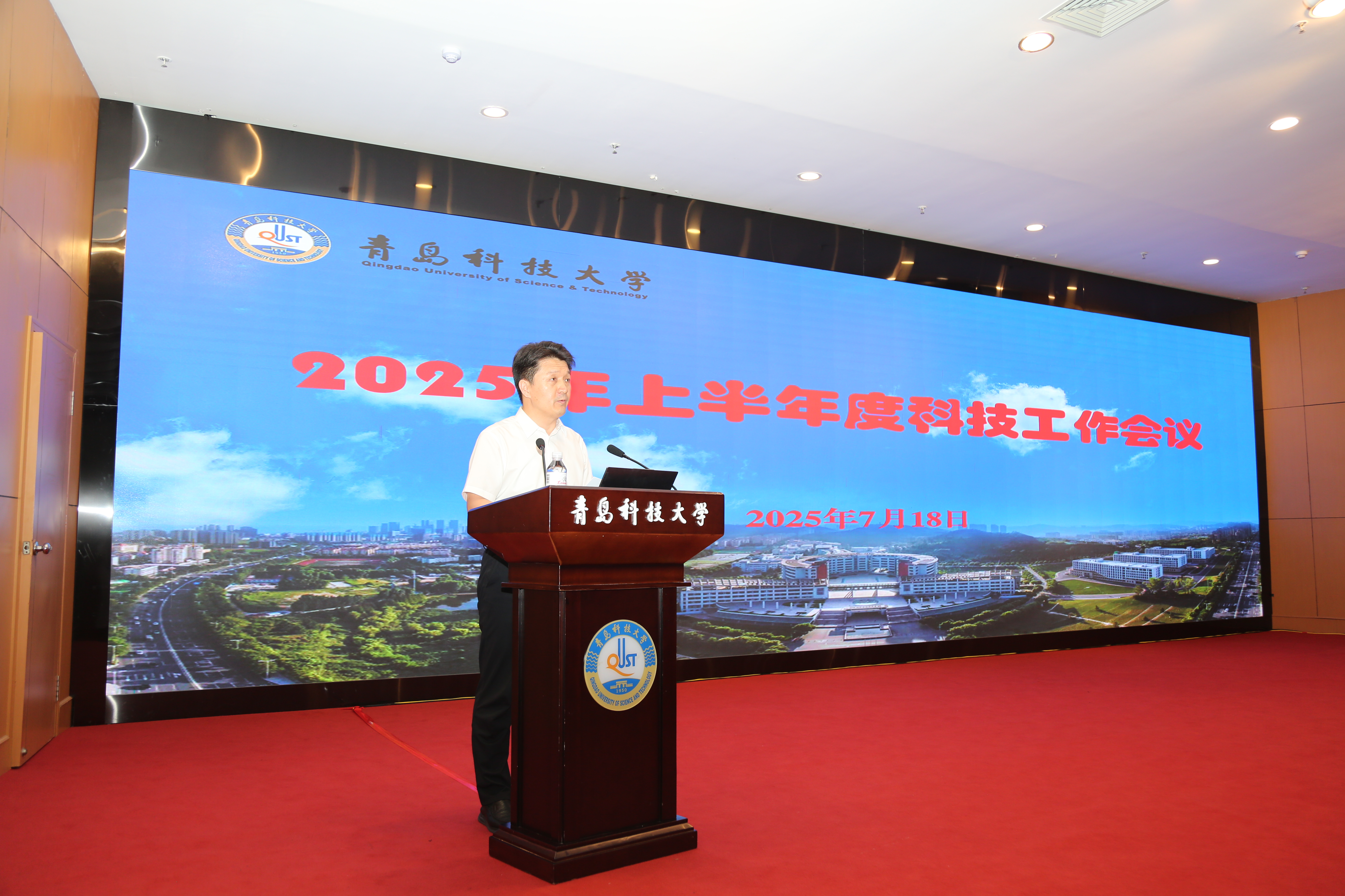 7月18日,学校2025年上半年度科技工作会议在崂山校区第三报告厅召开。校长陈克正出席会议并讲话。党委常委、副校长吴明铂主持会议。