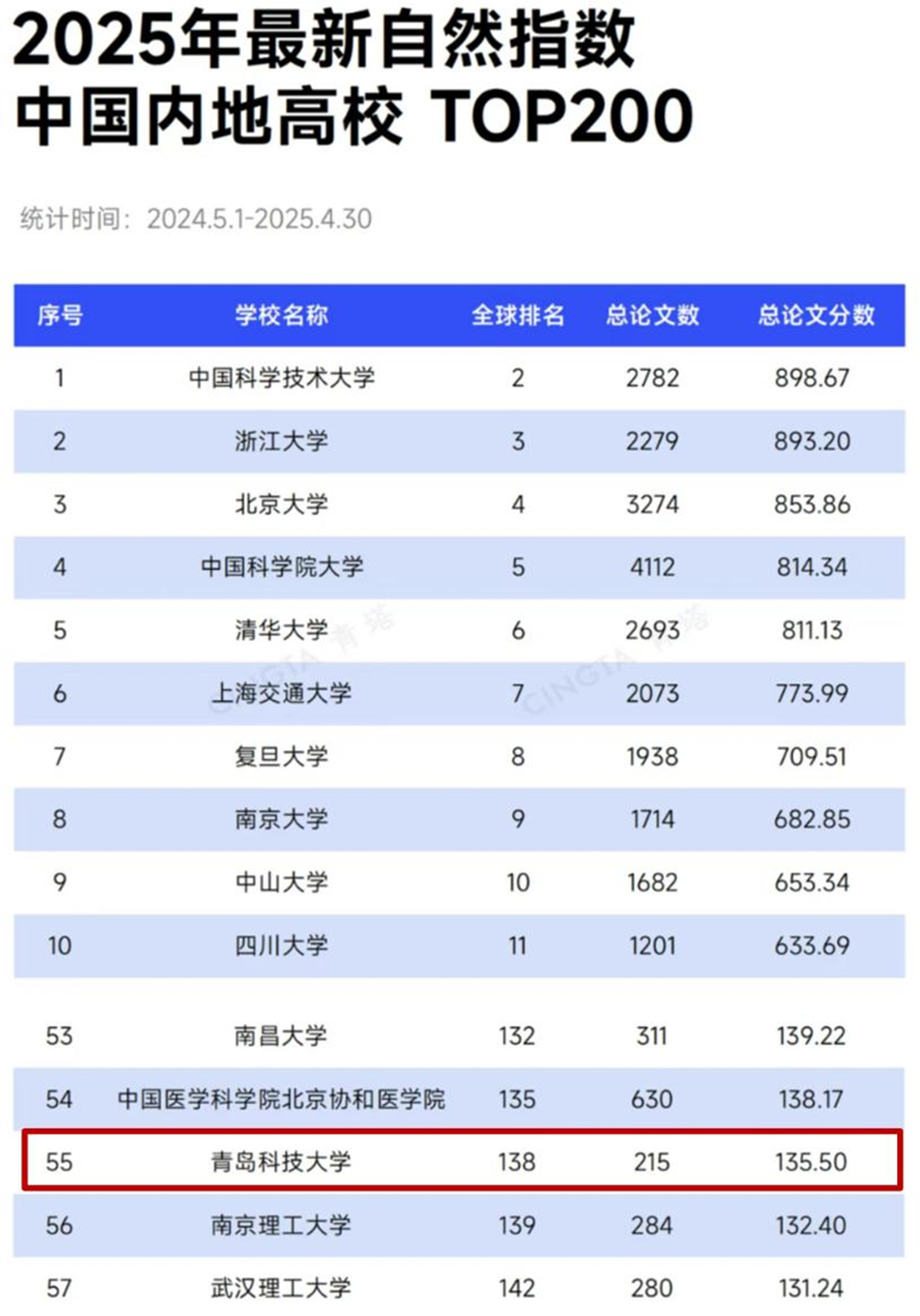 日前,自然指数官网更新了最新的自然指数排名(统计时间节点为2024.5.1-2025.4.30)。统计结果显示,中国内地共58所高校进入全球学术排名前150位,KY开元集团官网以发文总量215篇、总论文分数135.50的优异表现,居全球高校排名第138位,内地高校排名第55位;全球高校排名和内地高校排名分别比上期(统计时间节点为2024.4.1-2025.3.31)提升3个名次和5个名次。