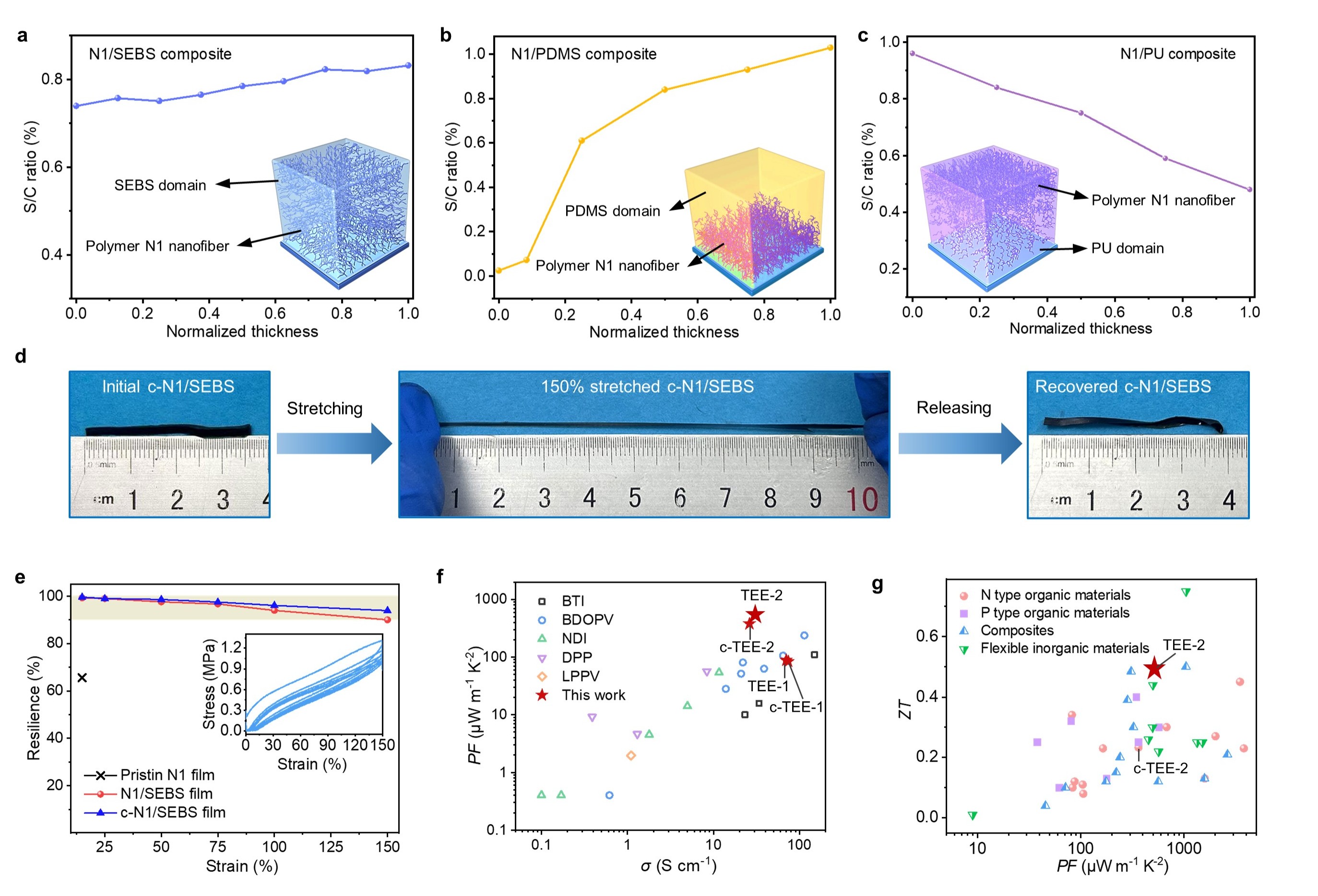 随着可穿戴电子设备和软生物电子学的飞速发展,如何提供高效、灵活的能源解决方案已成为亟待解决的关键问题。热电发电技术作为一种能够将温差转化为电能的有效方式,已展现出广泛的应用前景。然而,传统热电器件多采用无机热电材料,侧重于在刚性结构下的应用,缺乏弹性和形状适应性,在柔性和可穿戴设备中应用上受到显著限制。针对这一问题,刘凯开发了首个N型热电弹性体(TEE),一种兼具弹性、伸展性和热电转化能力的创新材料,为上述领域的能源采集技术开辟了新的方向。