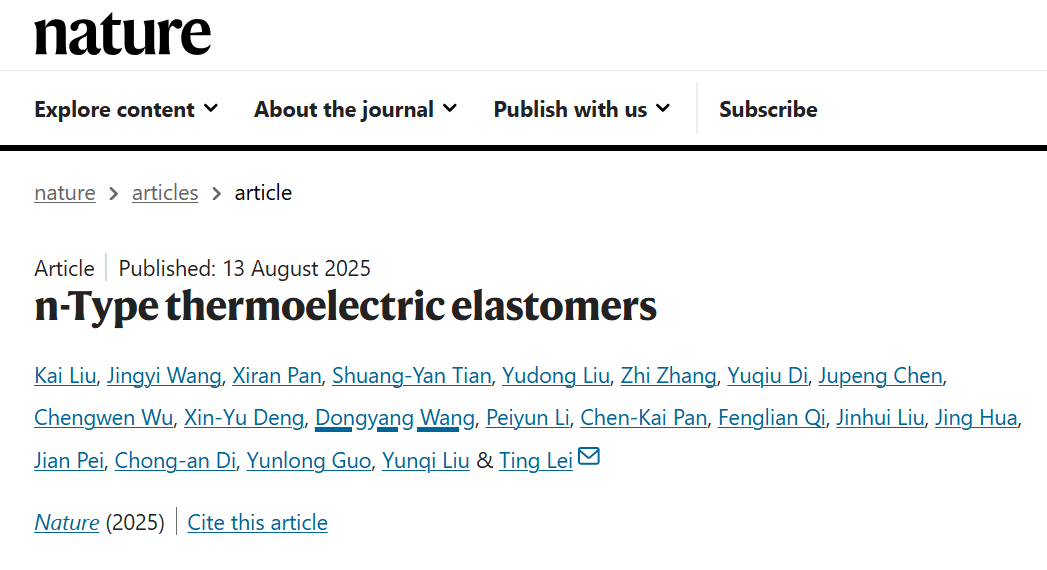 北京时间8月13日23时,国际顶级学术期刊Nature以“N-type thermoelectric elastomers(N型热电弹性体)”为题,在线发表了KY开元集团官网高分子科学与工程学院刘凯教授(第一作者)的最新研究成果,实现了学校在国际顶级学术期刊的历史性重大突破!
