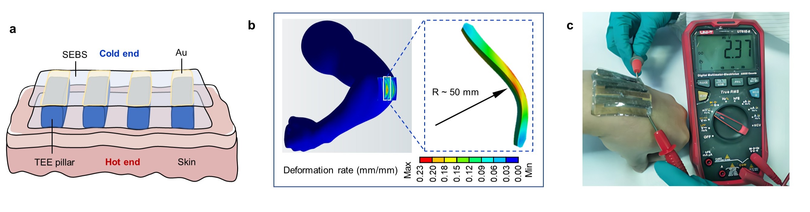 N型热电弹性体通过将均匀纳米相分离、热激活交联和定向掺杂三种策略相结合成功合成,展现出了卓越的拉伸性以及回弹性,拉伸应变高达850%,能够和传统的橡胶媲美。该材料的热电优值(ZT值)在300K时可达到0.49,接近甚至超越了现有的柔性或塑性无机热电材料的性能。通过精确选择弹性体和掺杂剂的组合,不仅能够改善拉伸性,还能促进均匀分布的半导体聚合物纳米纤维的形成,从而提升电导率并降低热导率,为热电材料在高效能与弹性可调性之间的平衡提供了崭新的解决方案。基于此,研究团队制造了首个弹性热电发电机,展示了其在人体热能收集中的应用,并展现了驱动可穿戴电子设备和生物传感器的潜力。与无机热电器件不同,弹性热电发电机无需复杂的互连结构,能够直接与皮肤表面适配,同时保持较高的填充因子和较低的热阻,使得该器件能够兼具高效的热电转换效率和优异的舒适性、形状适应性,为柔性电子学和可穿戴设备的能源采集技术提供了崭新的解决方案。