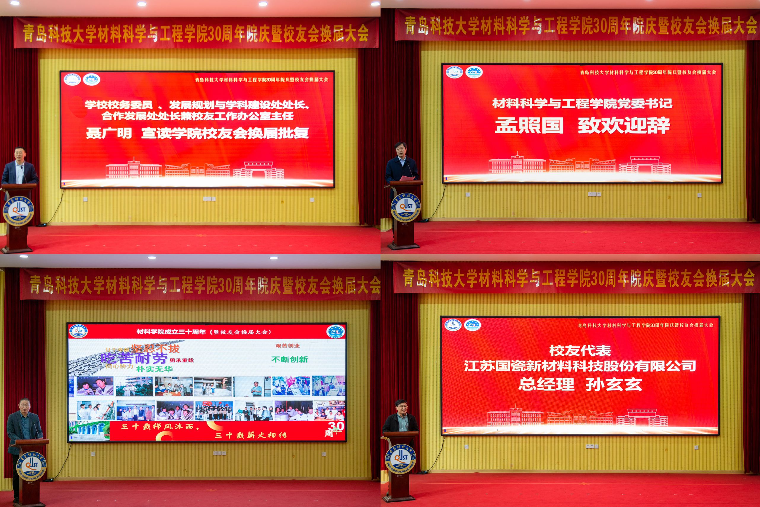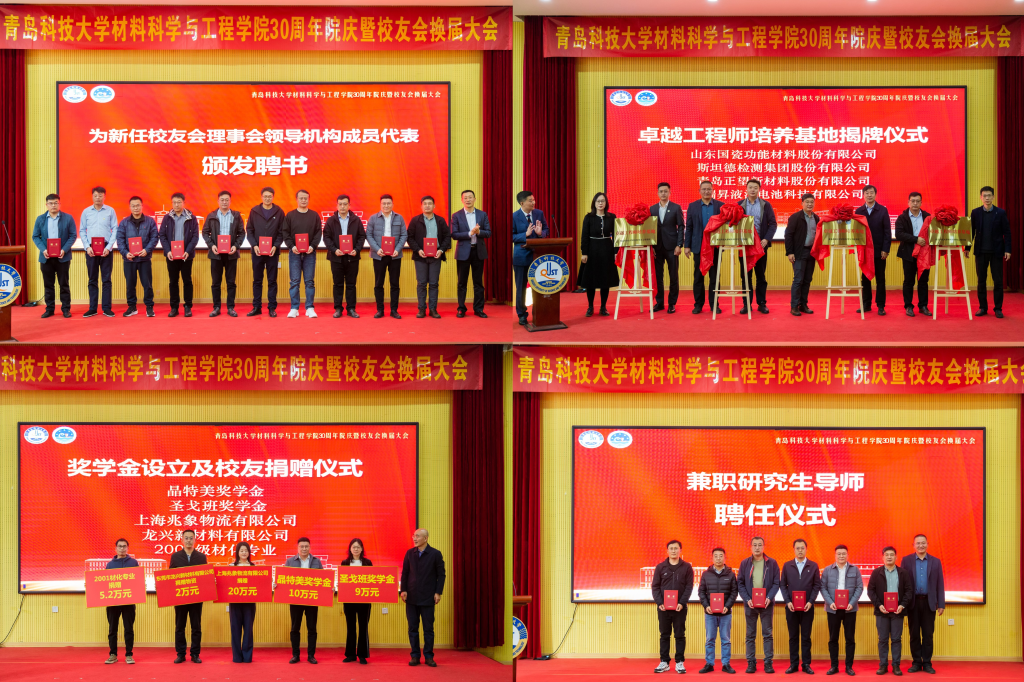 三十载栉风沐雨,薪火相传;三十载弦歌不辍,桃李芬芳。11月1日下午,材料科学与工程学院30周年院庆暨校友会换届大会在四方校区尚舜学术报告厅举行。校长、校友总会会长陈克正,校务委员、校友工作办公室主任聂广明,校友代表、忻州师范学院校长李新,黄山晶特美新材料有限公司董事长张泽中等出席活动。