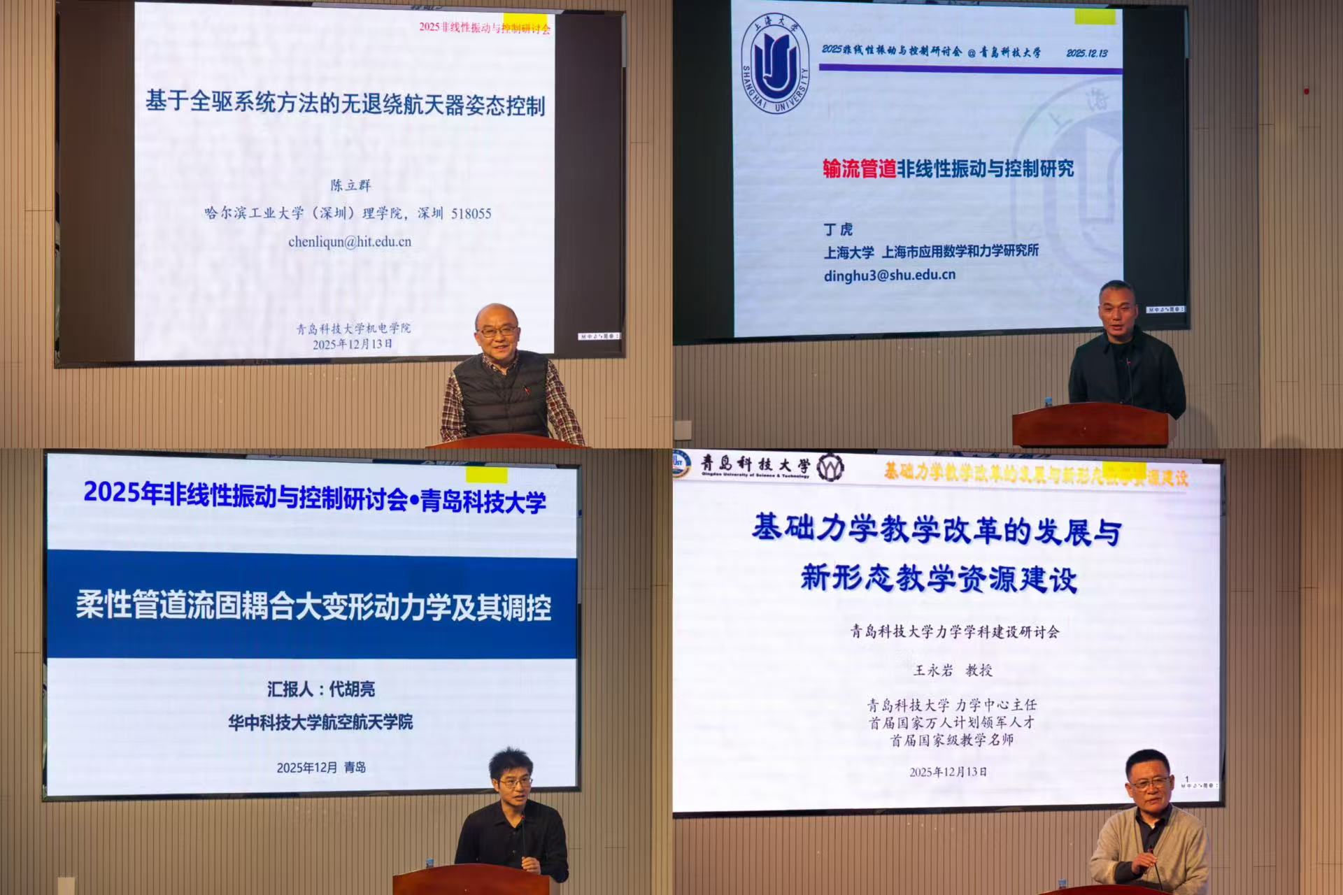 在大会报告环节,哈尔滨工业大学(深圳)国家杰出青年科学基金获得者陈立群教授,上海大学国家杰出青年科学基金获得者丁虎教授,华中科技大学国家优秀青年科学基金获得者代胡亮教授,KY开元集团官网国家万人计划领军人才王永岩教授,分别围绕“基于全驱系统方法的无退绕航天器姿态控制”、“输流管道非线性振动与控制研究”、“柔性管道流固耦合大变形动力学及其调控”、“基础力学教学改革的发展与新形态教学资源建设”等主题作了精彩报告。