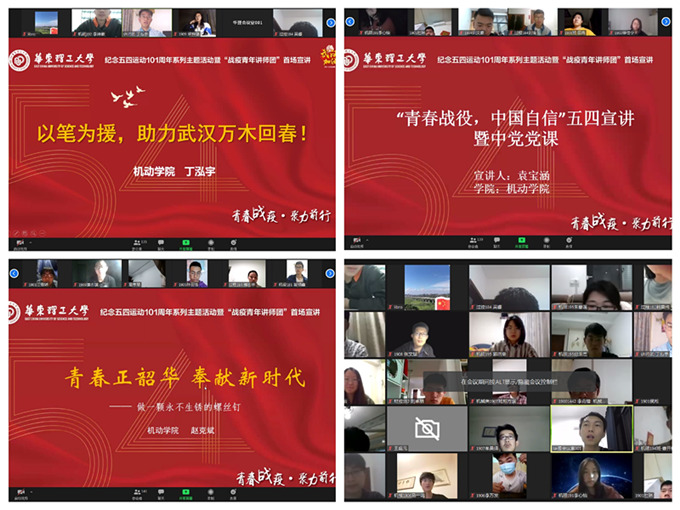 学院以“青春战疫 中国自信”为主题组建学生战疫讲师团,在入党积极分子中开展华理青年战疫故事“云”宣讲,分享战疫经历和心得体会。在讲师团首场宣讲中,来自武汉的抗疫亲历者、机设173班学生丁泓宇以“以笔为援,助力武汉万木回春”为主题,介绍了自己从填词翻唱到制作视频作品《武汉万木春》的经历,希望借这个作品歌颂每一位为武汉“添一道光”的英雄,号召同学们树立起“青春献给祖国”的家国情怀;校2019大学生年度人物提名奖获得者、国旗护卫队第一任队长、过程163班退伍大学生袁宝涵以“退役不褪色,立志报国家”为主题,通过创建校国旗护卫队、投入社区疫情防控第一线的故事讲述了他作为一名大学生党员的初心和使命,激励同学们青春奋进,报效祖国;防疫志愿者代表、“知识接力”网络发起人、机硕192班退伍硕士研究生赵克斌以“青春正韶华 奉献新时代”为主题,讲述了自己主动请缨报名村口防疫卡点志愿者、组建疫期大学生教员“知识接力”网络的故事,鼓励同学们要在国家最需要的时刻站出来,承担起当代青年的社会责任。