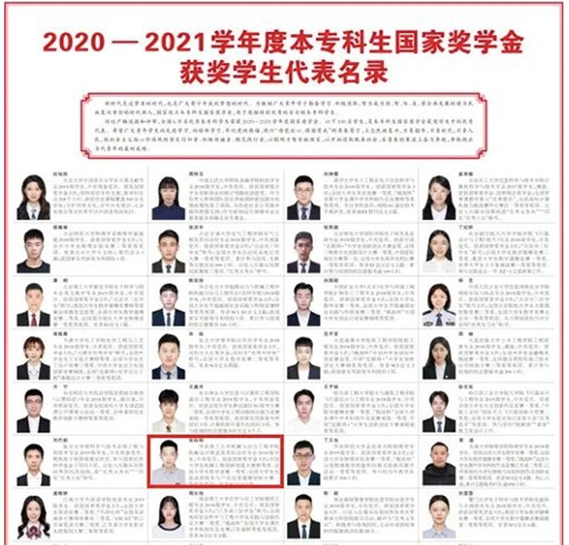 5月4日,《人民日报》刊登《2020-2021学年度本专科生国家奖学金获奖学生代表名录》,我校yl23455永利官网机械设计制造及其自动化专业2018级本科生张钰炯从6万名本专科国家奖学金获奖学生中脱颖而出,作为全国100名优秀学生代表荣登该名录。