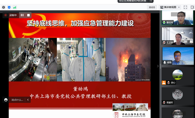 为进一步深入学习贯彻习近平总书记关于安全生产重要论述,强化理论武装,6月21日晚上,机动学院邀请中共上海市委党校(上海行政学院)公共管理教研部主任、上海市委党校应急管理培训中心主任董幼鸿教授作题为“坚持底线思维,加强应急管理能力建设”的辅导报告,学院全体教师通过腾讯会议参加学习。报告会由学院党委宣传委员王卫泽主持。