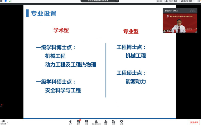 白志山聚焦专业设置、研究生导师整体情况、研究生整体情况、硕博培养方案、教学管理条例、奖学金设置、研究生教育管理人员等方面,介绍了学院研究生管理工作情况,并用“志存高远,勤奋求实”8个字与同学们共勉,希望同学们在机动学院学业进步。