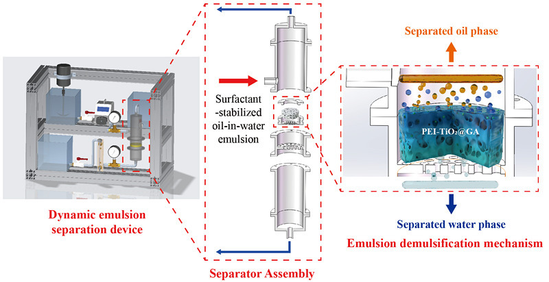 基于天然生物质明胶大分子自组装、二氧化钛颗粒预包埋和聚乙烯亚胺表面修饰技术,研究团队开发了两亲超润湿性仿生材料——PEI-TiO2@GA气凝胶。PEI-TiO2@GA不仅具有大容量油相吸收和染料吸附特性,还具有较高的机械强度。借助简单的预润湿过程,便可实现材料界面在超亲油性和超疏油性之间的选择性切换,并可重复使用。结合全新开发的连续分离装置,可一步实现乳化液高效破乳、微油滴聚结分离和共存污染物靶向去除。此外,研究发现PEI-TiO2@GA界面润湿性能的转变是一个可逆的多步过程,乳化液的破乳分离和共存污染物的吸附去除是两个独立的过程。本研究为用于复杂体系工业废水深度处理的高性能工程材料设计和开发提供了新颖的解决方案。