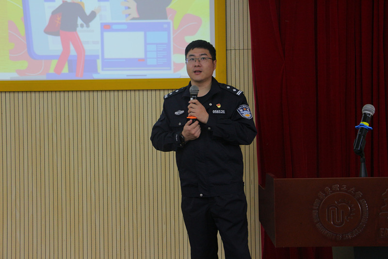 张志荣警官聚焦校园内的警务工作,倡导同学们要时刻保持警觉,增强自我保护意识。围绕校园内频发的诈骗事件,他详细讲解了一些典型的网络诈骗手法,向同学们传授了有效防范的方法。最后,他围绕网络安全,提醒同学们在社交媒体上不要发布不良言论,切实保护个人隐私。