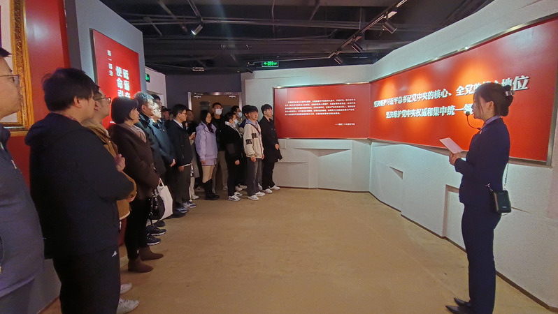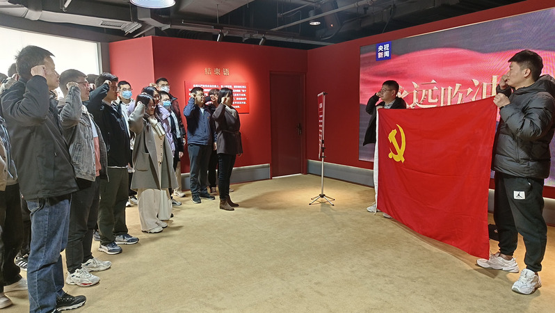 在最后一个展厅,全体师生党员高举右拳,面向鲜红的党旗重温入党誓词,铿锵的誓言,彰显了对党忠诚,为共产主义事业奋斗终身的决心!