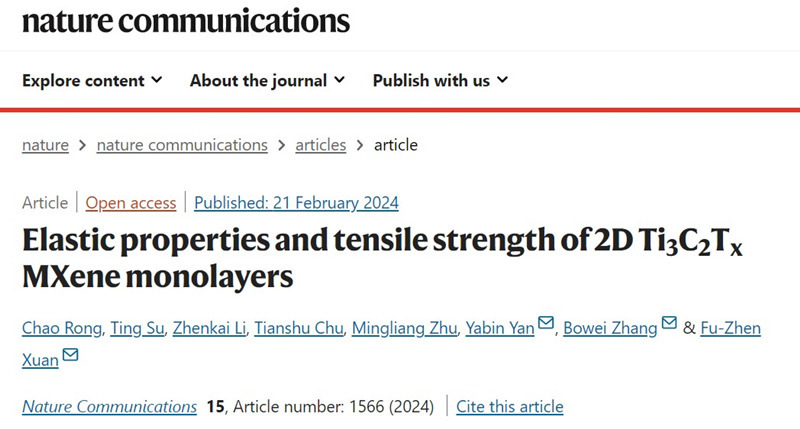 近日,我校yl23455永利官网张博威等在Nature Communications 上发表了题为 “Elastic properties and tensile strength of 2D Ti3C2Tx MXene monolayers” 的研究论文,在线报道了该课题组在Ti3C2Tx基柔性传感材料结构强度领域的研究进展,提出一种可靠、直接、定量的方法来测量单层Ti3C2Tx纳米片的力学性能。