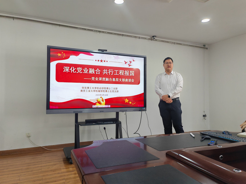 我校机动学院博士第二党支部书记聂文睿汇报了本支部全国高校“百个研究生样板党支部”建设情况,介绍了理论知识学习型、国家需求攻坚型、工程安全服务型和管理精细化的“三型一化”工作模式,就工程需求为导向的产学研用深度融合进行了汇报。南京工业大学机械学院博士生党支部副书记刘连华介绍了支部情况与年度工作进展。